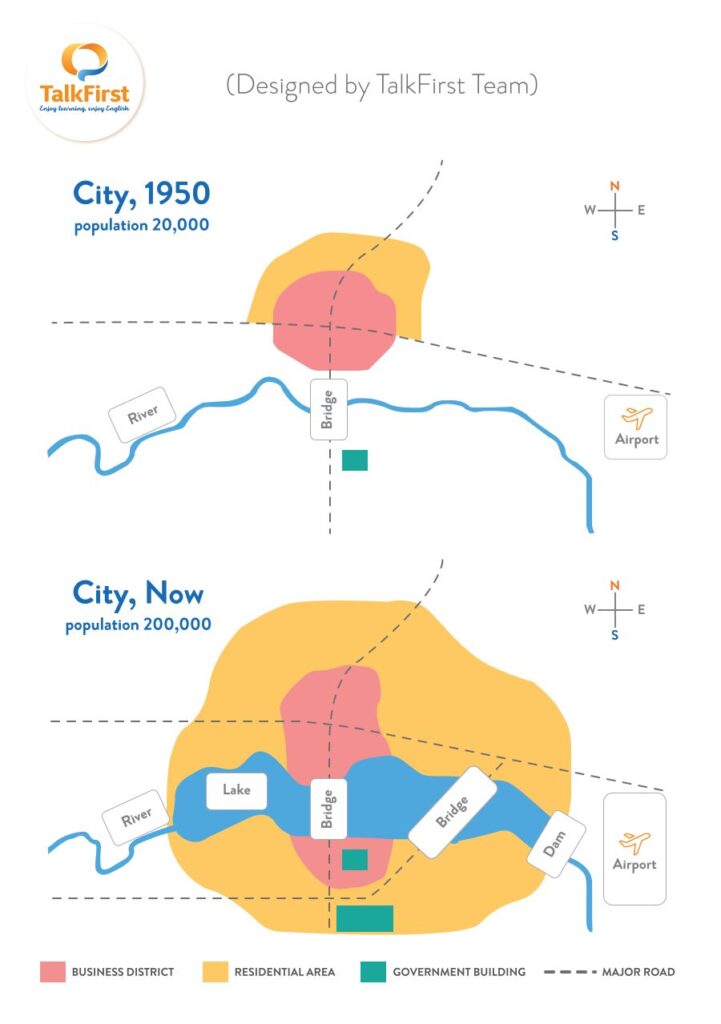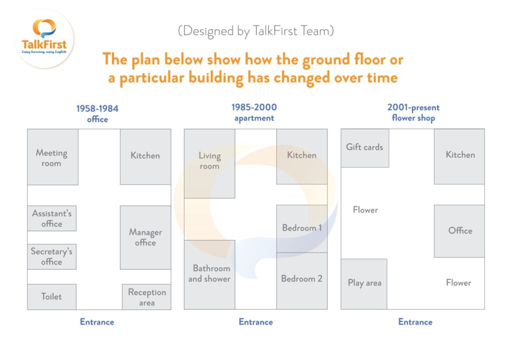 Task 1: The plans below show how the ground of a particular building has changed over time. Summarise the information by selecting and reporting the main features. (Dạng giống như đề này)