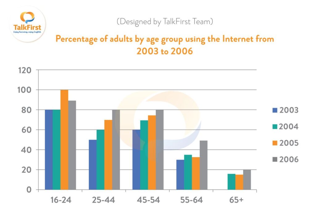 Task 1: The chart below shows the percentage of adults of different age groups in the UK who used the Internet everyday from 2003 to 2006.