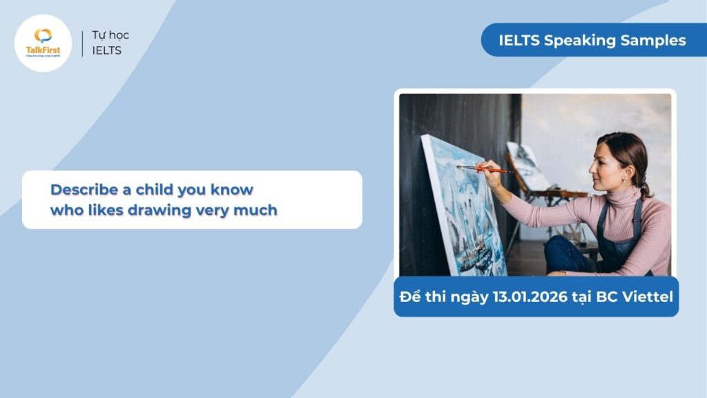 Trong đợt thi ngày 13.01.2026 vừa qua tại BC Viettel, các thí sinh đã bắt gặp chủ đề ‘Describe a child you know who likes drawing very much‘. Đây là một dạng đề ‘tưởng dễ mà khó’, bởi nếu không khéo léo, thí sinh rất dễ bị lặp lại các từ vựng đơn giản và thiếu chiều sâu khi miêu tả. Để giúp các bạn xử lý đề bài này một cách ấn tượng nhất, bài viết dưới đây sẽ phân tích một bài mẫu Band 7.5+ với cách triển khai ý tưởng độc đáo và hệ thống từ vựng ăn điểm về chủ đề Nghệ thuật & Trẻ em.