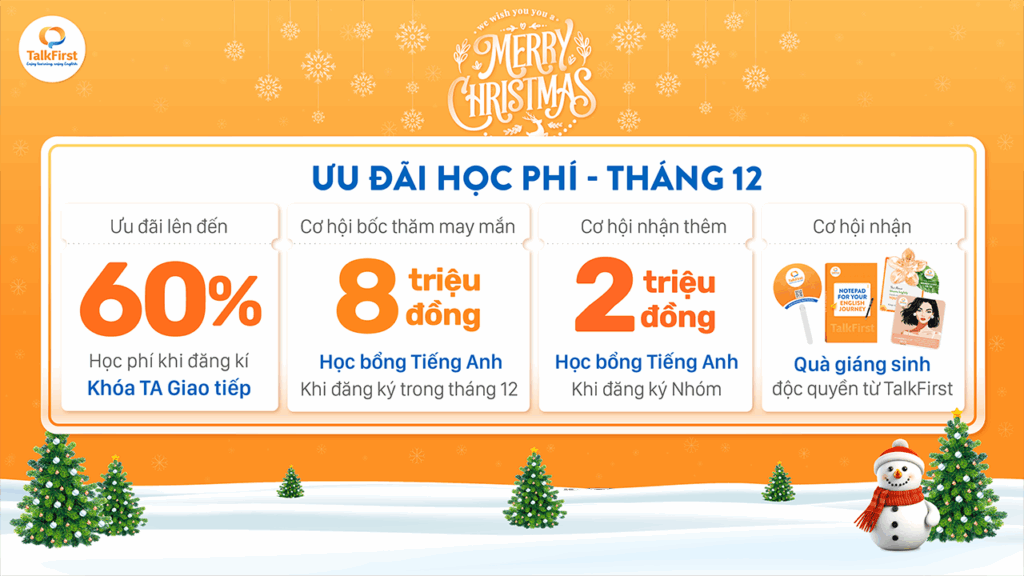 - Cơ hội bốc thăm may mắn 100% nhận quà Giáng Sinh từ Anh ngữ TalkFirst.