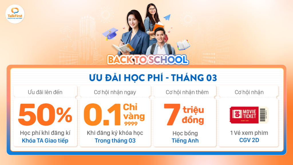 Để hỗ trợ tài chính cho quý khách hàng, TalkFirst thường xuyên áp dụng các chương trình ưu đãi hấp dẫn hàng tháng. Đặc biệt, trong tháng 03, TalkFirst đang áp dụng đa dạng các ưu đãi hấp dẫn như sau: