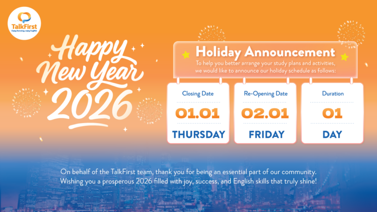 Một lần nữa, đội ngũ TalkFirst xin gửi lời cảm ơn chân thành đến quý anh chị học viên đã dành thời gian tham dự sự kiện. Kính chúc quý anh chị dồi dào sức khỏe và gặt hái nhiều thành công hơn nữa trong công việc với sự tự tin vào khả năng tiếng Anh của mình.