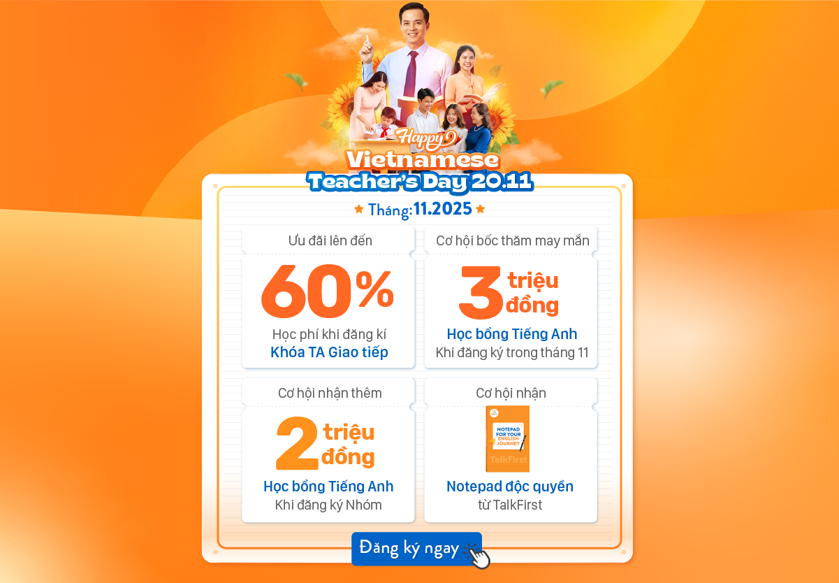Nhờ sự hướng dẫn tận tâm của thầy cô và không khí học tập tích cực, em ngày càng tự tin hơn, khả năng phản xạ linh hoạt hơn, và mỗi buổi học đều mang đến niềm vui. TalkFirst đã giúp em cải thiện kỹ năng giao tiếp, mở rộng tư duy và biến tiếng Anh trở thành một phần không thể thiếu trong cuộc sống. Em vô cùng biết ơn sự hỗ trợ của ban giám hiệu và các thầy cô trong suốt hành trình này. Nếu có ai thắc mắc vì sao em có thể nói tiếng Anh trôi chảy như vậy, em sẽ không ngần ngại giới thiệu TalkFirst là nơi tuyệt vời để rèn luyện và chinh phục ngôn ngữ này.